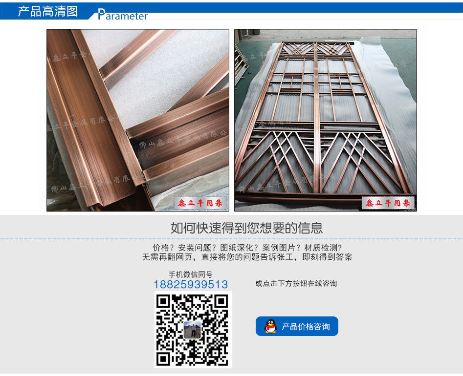 產(chǎn)品尺寸:根據(jù)需求定制 產(chǎn)品材質(zhì):201、304、316L 可選顏色:玫瑰金、鈦金、黑鈦金、香檳金、青古銅、紅古銅、咖啡金、灰色、按樣板定制 適用場所: 酒店、餐廳、會所、售樓部、商場、別墅、KTV
