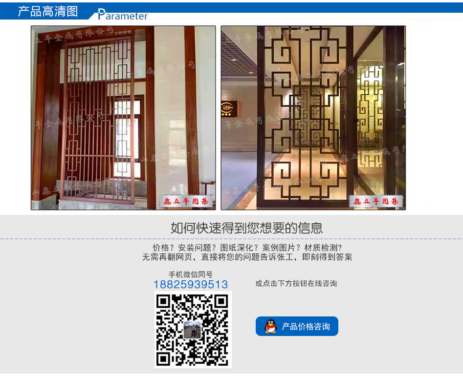 產(chǎn)品尺寸:根據(jù)需求定制 產(chǎn)品材質(zhì):201、304、316L 可選顏色:玫瑰金、鈦金、黑鈦金、香檳金、青古銅、紅古銅、咖啡金、灰色、按樣板定制 適用場所: 酒店、餐廳、會所、售樓部、商場、別墅、KTV