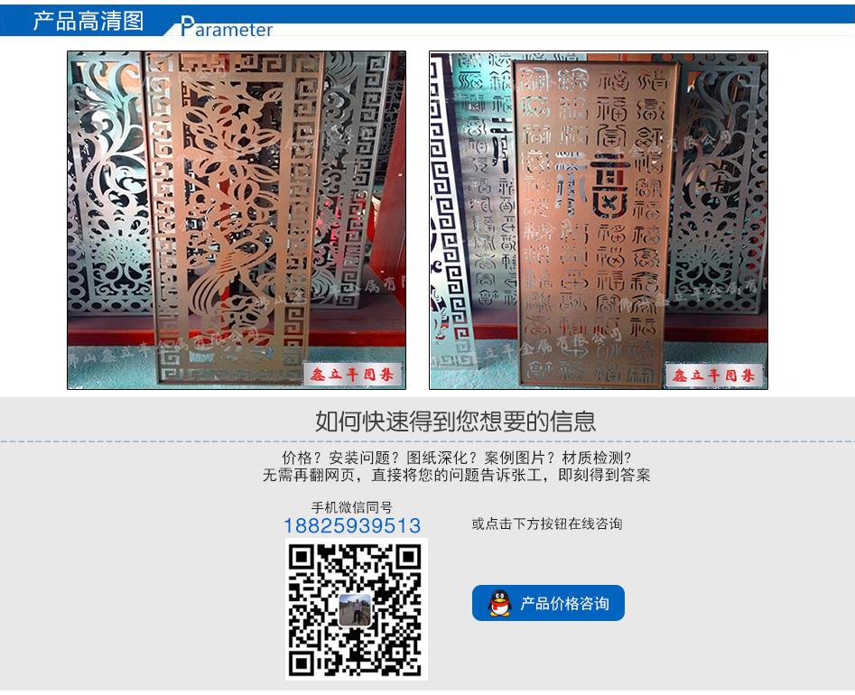產(chǎn)品尺寸:根據(jù)需求定制 產(chǎn)品材質(zhì):201、304、316L 可選顏色:玫瑰金、鈦金、黑鈦金、香檳金、青古銅、紅古銅、咖啡金、灰色、按樣板定制 適用場所: 酒店、餐廳、會所、售樓部、商場、別墅、KTV