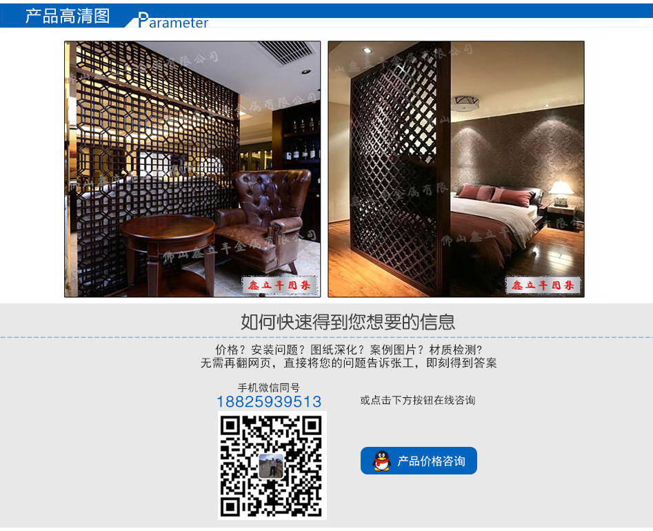 產(chǎn)品尺寸:根據(jù)需求定制 產(chǎn)品材質(zhì):201、304、316L 可選顏色:玫瑰金、鈦金、黑鈦金、香檳金、青古銅、紅古銅、咖啡金、灰色、按樣板定制 適用場(chǎng)所: 酒店、餐廳、會(huì)所、售樓部、商場(chǎng)、別墅、KTV