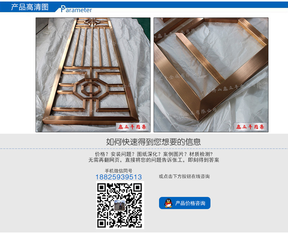 產(chǎn)品尺寸:根據(jù)需求定制 產(chǎn)品材質:201、304、316L 可選顏色:玫瑰金、鈦金、黑鈦金、香檳金、青古銅、紅古銅、咖啡金、灰色、按樣板定制 適用場所: 酒店、餐廳、會所、售樓部、商場、別墅、KTV
