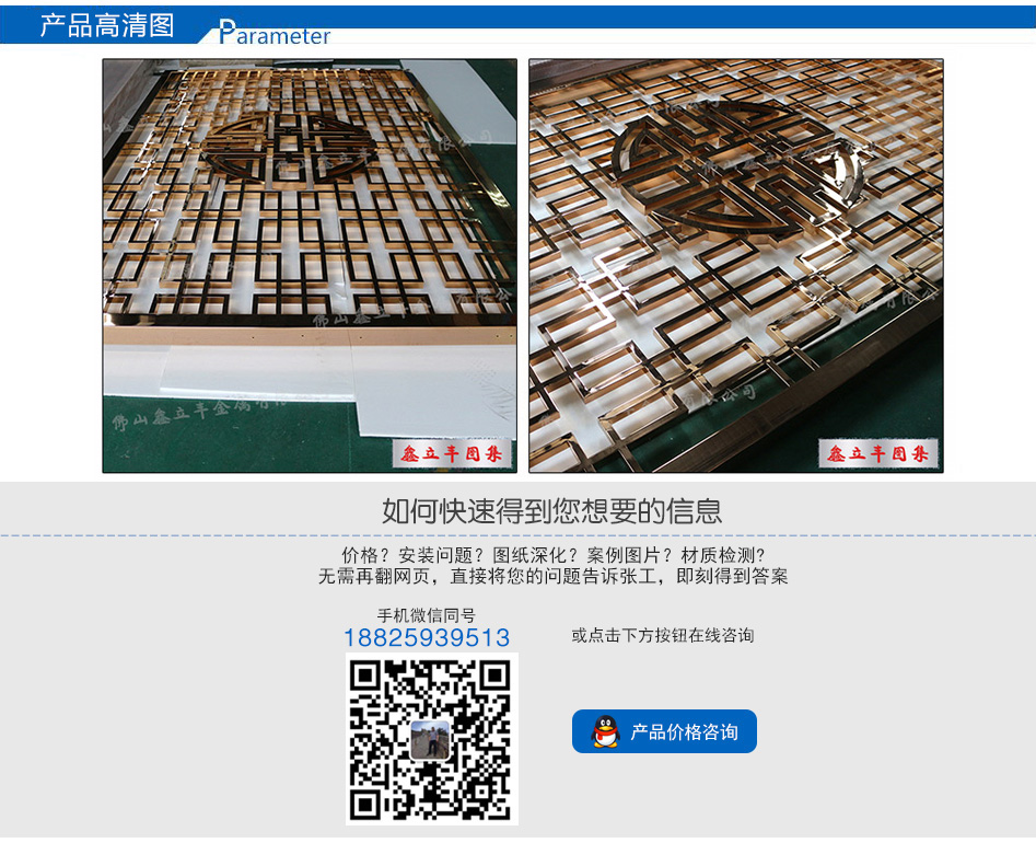 產(chǎn)品尺寸:根據(jù)需求定制 產(chǎn)品材質(zhì):201、304、316L 可選顏色:玫瑰金、鈦金、黑鈦金、香檳金、青古銅、紅古銅、咖啡金、灰色、按樣板定制 適用場(chǎng)所: 酒店、餐廳、會(huì)所、售樓部、商場(chǎng)、別墅、KTV