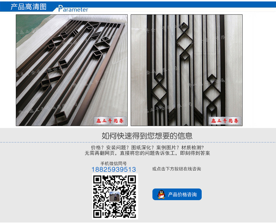 產(chǎn)品尺寸:根據(jù)需求定制 產(chǎn)品材質(zhì):201、304、316L 可選顏色:玫瑰金、鈦金、黑鈦金、香檳金、青古銅、紅古銅、咖啡金、灰色、按樣板定制 適用場所: 酒店、餐廳、會所、售樓部、商場、別墅、KTV
