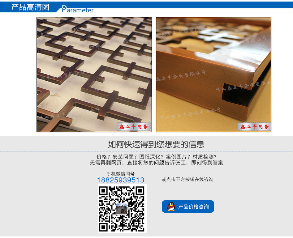 產品尺寸:根據需求定制 產品材質:201、304、316L 可選顏色:玫瑰金、鈦金、黑鈦金、香檳金、青古銅、紅古銅、咖啡金、灰色、按樣板定制 適用場所: 酒店、餐廳、會所、售樓部、商場、別墅、KTV