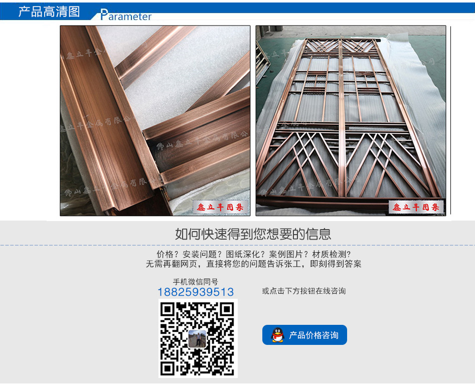 產(chǎn)品尺寸:根據(jù)需求定制 產(chǎn)品材質(zhì):201、304、316L 可選顏色:玫瑰金、鈦金、黑鈦金、香檳金、青古銅、紅古銅、咖啡金、灰色、按樣板定制 適用場(chǎng)所: 酒店、餐廳、會(huì)所、售樓部、商場(chǎng)、別墅、KTV